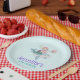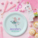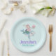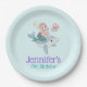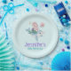 Geburtstagspapier-Teller mit einer hübschen Abbildung. Entworfen mit einer hübschen Meerjungfrau, die einen glücklichen Delphin reitet. Ein kleiner Quallenfreund begleitet sie. Dekoriert mit kleinen Spritzern von Imitaten Gold Glitzer. Hellblauer Hintergrund.