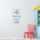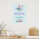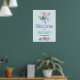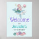 Geburtstags Begrüßungspposter mit einer bezaubernden Abbildung. Entworfen mit einer hübschen Meerjungfrau, die einen glücklichen Delphin reitet. Ein kleiner Quallenfreund begleitet sie. Dekoriert mit kleinen Spritzern von Imitaten Gold Glitzer. Hellblauer Hintergrund mit verblassten rosa Polka-Punkten.