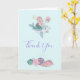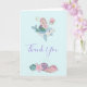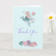 Vielen Dank Karte mit einer schönen Abbildung. Entworfen mit einer hübschen Meerjungfrau, die einen glücklichen Delphin reitet. Ein kleiner Quallenfreund begleitet sie. Dekoriert mit kleinen Spritzern von Imitaten Gold Glitzer. Muscheln und Seesterne am Boden. Hellblauer Hintergrund.