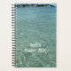 Ozeanwasser-Jahresplaner mit individuellem Text auf der Vorderseite. Blau-grüne, klare Meerwasser-Fotografie mit wirbelnder Schriftvorlage für einen Namen oder Titel. Die Ansicht ist an einer Ozeanbucht, mit Land und einem Leuchtturm in der Ferne.