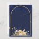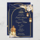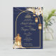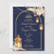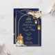Marokkanische Laternen sternenklare Nacht golden arch Mehndi Einladung. Dunkelblauer Hintergrund mit getrockneten Blume an Ecken mit hängenden Laternen.
