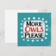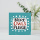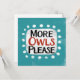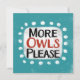 "More Owls Bitte" ist ein niedliches Textdesign in blau mit schwarzem und rotem Text, mit weißer Akzent-Form und weißen, texturierten weißen, weißlichen, weißlichen Punkten, die ihn umgeben.