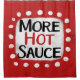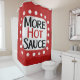 "More Hot Sauce" ist ein niedliches Textdesign in rot mit schwarzem und rotem Text, mit weißer Akzent-Form und weißen, texturierten weißen, weißlichen Punkten, die ihn umgeben.