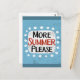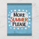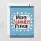 "Mehr Sommer bitte" ist ein niedliches Textdesign in blau mit schwarzem und rotem Text, mit weißer Akzent-Form und weißen, texturierten weißen, weißlichen Punkten, die ihn umgeben.