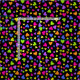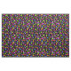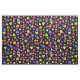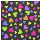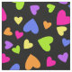 Ein Muster der geworfenen Herzen in den rosa, orange, gelben, grünen, blauen und lila Farben auf einem schwarzen Hintergrund.
