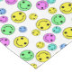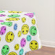 mehrfarbig fröhliche Emoji-Gesichter mit gemustertem Tischtuch