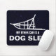 Text, der "MEIN ANDERES AUTO IST EIN HUND SLED" und eine weiße Silhouette eines Hundes auf einem sternenförmigen Hintergrund.