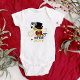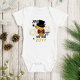 Mein erster Niedlicher Baby Boy Gold Glitzer Baby Bodysuit Ein Stück enthält den Text "Mein erstes neues Jahr (Jahr hinzufügen)" in einem modernen Drehbuch mit goldenem Glitzer, das mit Sternen, Feuerwerken, einem Top Hut und karierter -Krawatte in Rot versehen ist. Evco Holidays www.zazzle.com/store/evcoholidays