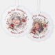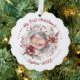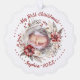 Baby's First Christmas Blumenkranz Foto Papier Ornament Card. Diese Schmuckkarte feiert das erste Weihnachtsfest eines Babys mit einem hübschen Blumenkranz, der mit Blume, Beeren und Blätter in Rot- und Beige-Tönen geschmückt ist. In der Mitte ist ein Foto des Babys gerahmt, begleitet von der eleganten Schrift "Mein erstes Weihnachtsfest" darüber, die mit dekorativen Punkten betont wird. Unter dem Bild werden der Name des Babys und das Jahr in einem lebhaften Rot hervorgehoben. Die Rückseite spiegelt dieses reizende Design wider, das ein zusätzliches süßes Foto des Babys enthält und die Karte aus jeder Perspektive zu einem fröhlichen Sake macht.