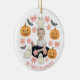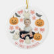 Feiern Sie mit diesem My First Halloween Baby Ornament den sprichwörtlich süßen Meilenstein Ihres Kleinen. Dieses Design mit einem charmanten Kürbis, Gespenstern, Süßigkeiten, Blume und Blätter rund um das Foto Ihres Babys ist ideal, um ihr erstes Halloween zu markieren. Personalisieren Sie es mit dem Bild und dem Namen Ihres Babys, um einen einzigartigen Sake zu schaffen, der jahrelang geschätzt wird. Ideal als Saisondekoration, Baby-Duschgeschenk oder Halloween-Gedächtnis für Ihre Familie.