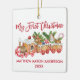 Modernes Pinselskript Mein erstes Weihnachtsjugendornament beinhaltet einen Aquarellzug mit Süßigkeiten, Keksen und Pinien.