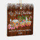 Modernes Pinselskript Mein erstes Weihnachtsjugendornament beinhaltet einen Aquarellzug mit Süßigkeiten, Keksen und Pinien. Rustikales Land Holz Print mit Schnee.