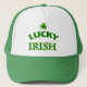 Niedlicher grüner LKW-Hut mit weißem Zentrum mit Klee und den Worten Lucky Irish. Es ist ein tolles Geschenk für jeden, der will, seinen irischen Stolz zu zeigen oder auch nur für den St. Patrick's Day.