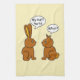 Mein Hintern tut weh! -Was ist? Zwei Schokoladensträucher mit jeweils einem Biss haben sie abgenommen. Der eine sagt, sein Hintern tut weh, der andere kann ihn nicht hören, weil seine Ohren abgekaut sind. Das sonnige Sprichwort für Kaninchenfreunde und die Osterferien.