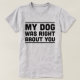 Mein Hund war über Sie T - Shirt recht. Ich sollte zu meinem Hündchen gehört haben. Hunde können Sachen abfragen, die wir nicht können und meine wussten, dass Sie Problem von Anfang an waren. Vertrauen Sie immer der Nase eines Welpen.