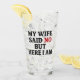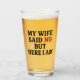 Heben Sie einen Toast mit einer Touch Spaß. Dieses Glas enthält den frechen Satz "Meine Ehefrau sagte Nein, aber hier bin ich", perfekt für jeden mit einem spielerischen Sinn für Spaß. Ideal, um Ihre Lieblingsgetränke zu genießen - sei es ein kaltes Bier oder ein klassisches Erfrischungsgetränk. Als Gag-Geschenk, Geburtstagsgeschenk oder einfach nur zum Lachen auf der Zuhause, dieses Glas ist garantiert, Gespräche zu starten und Lächeln zu bringen. Zeige deine schelhafte Seite ab - ein Schluck nach dem anderen!