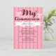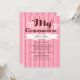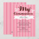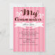 Beginnen Sie Ihre Feier mit dieser Einladung für die besondere Mädchen Heilige Kommunion. Der Hintergrund hat mehrere Farben von rosa Streifen. Oben in der Mitte befindet sich "Meine erste Kommunion" in einem großen Schriftart Unter diesem ist ein Banner, wo Sie personalisieren mit Mädchennamen. Fügen Sie Ihre Party-Informationen darunter zu personalisieren. Karo die vielen anderen Artikel in dieser Zeile, wie Etiketten, Porto, Dankeschön Notizen, und mehr.