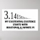 Zeigen Sie Ihren Pi-Fan mit diesem Poster mit der irrationalen und unendlichen Zahl pi zusammen mit dem folgenden Sprichwort, das andere dazu bringen wird, eine doppelte Meinung über Pi zu machen: "My Existential Existence Starts with Irrational & Infinite Pi".