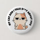 Ein lustiges Abzeichen für Katzenliebhaber, das in schwarzem Text mit den Worten "Meine Katze und ich reden S**T Über euch" eine mug aussehende Katze vorstellt. Dies ist eine Vorlage, wenn Sie den Text ändern möchten.