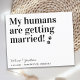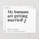 Meine Menschen werden heiraten! Lass Deinen besten Hund mit diesem modernen und einfachen "My Humans Are Getting Married" Haushund, der die Datumskarten speichert, um deine Hochzeit bekannt zu geben. Personalisieren Sie Ihre Daten mit Namen, Datum und Hochzeitsort. Diese Hochzeit speichern Sie das Datum Ankündigung wird ein Hit mit Ihrer Familie und Freunden. COPYRIGHT © 2020 Judy Burrows, Black Dog Art - Alle Rechte vorbehalten. Meine Menschen heiraten sich Save the Date auf Postkarte