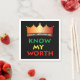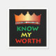 Napkins mit den Worten "Know My Worth" in afrikanischen Farben, mit einer goldenen Krone oben.