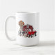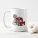 Die Tasse aus rotem Stall mit niedlichen Tieren. Aquarellbilder beleuchten die Lebensfreude auf einem Bauernhof oder einem kleinen Haushof. Günstige Geschenke für besondere Anlass, die Sie am Bauernmarkt an Ihren Lieblingsverkäufer weitergeben können.