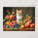 Die Katze sitzt anmutig in einer stillen Lebenszusammensetzung, die mit einer Fülle von Früchten und blühenden Blume gefüllt ist.