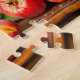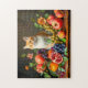 Die Katze sitzt anmutig in einer stillen Lebenszusammensetzung, die mit einer Fülle von Früchten und blühenden Blume gefüllt ist.