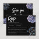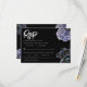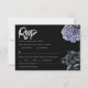 Eine kühne und anspruchsvolle RSVP-Karte mit dramatischen staubblauen und grauen floralen Illustrationen vor einem scharfen schwarzen Hintergrund. Die knackige weiße Typografie und das klassische Layout setzen einen eleganten, melancholischen Ton. Perfekt für einen formellen Abend oder eine anspruchsvolle Hochzeit.