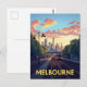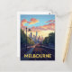 Capture the unique cityscape of Melbourne, Australia, with this charming retro travel postcard. The design features a train arriving at a sunny station, framed by lush parkland, with the distinct Melbourne Skyline and its prominent towers in the distance. This artwork perfectly blends the city's urban energy with its picturesque setting. Ideal for celebrating a visit to Victoria's capital, giving as a souvenir, or decorating your space with a piece of stylish, vintage-inspired Australian art.