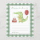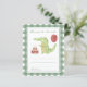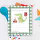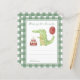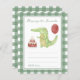 Party mit Aquarellfarben-Kindergeburtstag. Wasserfarbe Krokodil oder Alligator, Kuchen mit Kerzen, roter Ballon. Grüner Käfighintergrund.