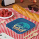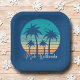 Diese niedliche Weihnachtsfeierplatte aus hawaiianischem Party besticht durch einen tropischen Sonnenuntergang auf coolem, blauen Hintergrund mit einem zeichn von Küstenpalmen und einem Sonnenuntergang am Meer. Mele Kalikimaka in kursiver Typografie über diese hübsche Familienurlaubsdekoration geschrieben.