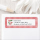 Traditional candy cane red and pure white gingham check patterned framed return address label with a super cute snowman couple image next to the custom return address. All text is of course editable. Check out the many fun Mellow Snowmen collection's matching Christmas cards, cute custom photo ornaments, pillows, stickers, stockings, and many other matching items! Merry Christmas!