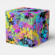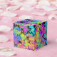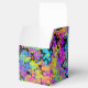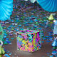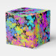 Multi-colored bold rainbow swirls on a black background, resembling melted crayon shavings.