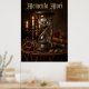 A masterfully composed Vanitas still life for the modern age — an ornate brass and mahogany hourglass holds a human skull suspended in falling black sand, a timeless reminder that every grain marks a moment that cannot be reclaimed. Flanked by a flickering brass candelabra and surrounded by dried crimson roses scattered across rich velvet, this piece draws deeply from the Dutch Golden Age tradition of Vanitas painting — art designed to remind the viewer of life's fragility and the inevitability of death. Aged occult volumes stacked nearby hint at forbidden knowledge sought but never fully grasped. The warm amber candlelight against deep shadow creates a painting of extraordinary atmospheric depth, as if lit from within. Crowned with bold blackletter "Memento Mori" typography, this poster is both a philosophical statement and a stunning decorative piece. Perfect for dark academia interiors, stoic philosophy enthusiasts, gothic home décor, occult collectors, and anyone who lives with intention and finds beauty in life's impermanence.