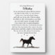 Eine schöne Gedenkfeier an ein geliebtes Pferd. Das Gedicht, spirituell in der Natur, von Stephanie Laird, handelt von Leben und Liebe. In einem modernen minimalistischen Look wird ein geiles Pferd auf weißem Hintergrund silhoutiert. Ändern Sie den Namen auf der Vorderseite unter in liebevollem Gedächtnis und machen Sie dies zu einer wunderbaren Plakette zum Ausstellen und Erinnern Ihres Pferdes. Das macht auch ein sehr nachdenkliches Geschenk.