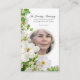 This elegant memorial prayer card features a soft white floral arrangement with gentle green foliage surrounding a customizable photo of your loved one. The front includes editable text for the name, dates, and a short remembrance line, creating a warm and heartfelt tribute. The back of the card displays a traditional prayer in a clean, readable layout with a simple cross symbol, set against a subtle textured white background. Every element—including the prayer, background, and floral accents—can be personalized to suit any funeral, memorial service, or celebration-of-life gathering. A beautiful keepsake for family and friends to cherish.