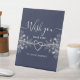 Elegantes, modernes marineblaues Hochzeitstil-Tafelschild mit Silberseilherz und Vintag vergoldeter Blumenspitze. Ich wünschte, du wärest hier.
