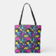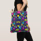 Funky Memphis drucken dunkelblaue Tote-Tasche mit neongeometrischem Muster und einem Monogramm-Quadrat auf der Vorderseite, um Ihre eigenen Initialen hinzuzufügen