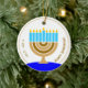 Ornament: moderne Menorah mit blauen Kerzen für Ihren Hanukka-Busch. Happy Hanukkah in Hebräisch und Englisch an der Front.