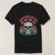 Vintages psychedelisches T - Shirt Design mit einer kühnen Grunge Ästhetik. Ein gebrochener menschlicher Schädel, der sich auf grünem surrealem Boden ruht und um ihn herum bunte Pilze (blau und aquamarin) wachsen. Hellrosa bläst mit grünen Stielen, die aus den Augensockel und dem Schädel wachsen. Rote Flammen im Hintergrund, die ein chaotisches Ambiente schaffen. Oberhalb des Schädels, in fett gedruckter Retro-Schrift, die Phrase "WEIRD BIS ZUM ENDE". Verwenden Sie kühne, kontrastreiche Farben, schwere Konturen und eine leicht bedrückte Textur für einen abgenutzten, Vintagen Ausdruck. Schwarzer Hintergrund.