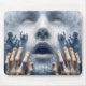 Händchen und Gesichtsausdruck auf nasses Glas mit Silhouette einer Not leidenden Menschenmenge, die ausreicht