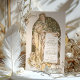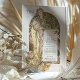 Dieses elegante Jugendstil-Dinner-Menü zeichne Inspiration aus dem ikonischen Stil von Alphonse Mucha. Dieses Menü mit einer anmutigen Frau mit Blumenmotiven und aufwändigen Mustern strahlt Vintagen Charme aus mit sanften Tönen von Beige, Gold, Salbei und Pfirsich. Die detaillierte Abbildung auf der Vorderseite wird durch ein minimalistisches Design auf der Rückseite wunderschön ergänzt, was dieses Menü zu einer perfekten Wahl für Paare macht, die klassische Kunst und zeitlose Eleganz schätzen. Ideal für eine Vintag-thematische oder kunstlich-inspirierte Hochzeit, fügt dieses Menü eine Touch der Verfeinerung zu Ihrem besonderen Ereignis hinzu.