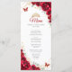 Rot, Gold und Weiß Quinceanera Feiern schlank doppelseitige Programm und Menü-Karte. Features, Skript-Schriftart, Goldschmetterlinge, Aquarellfarben-Rose und Tiara. Ideal für eine elegante Glasfeier im Prinzessinnstil. Personalisieren Sie Ihre persönlichen Daten.