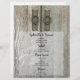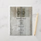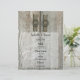 Das bezaubernde Doppel-Barn Doors Country Farm Wedding Menü mit den Details des Essens, das Sie in Ihrem Stall Party oder Ranch-Stil Probe Abendessen, Ehe Empfang oder Hochzeitsbrunch servieren, indem Sie den Salat oder erste Gang, Vorspeise oder Zweitgang und Dessert oder dritter Gang. Dieses lässige und dennoch elegante, rustikale Hochzeitsmenü bietet ein malerisches Landschaftsfoto von zwei verwitterten Holztüren mit eleganter Hardware.