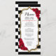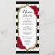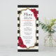 Menükarte. Klassisches Schwarz-weißes rotes Design mit Imitaten Glitzer Gold. Blumendesign mit schwarz-weißen Streifen, Skript-Schriftart und rote Rosen. Ideal für ein elegantes Party.