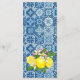 Moderne und elegante Karte in Weiß und Blau. Das Design besteht aus einem Paar Zitronen mit grünen Stielen und einem mediterranen Fliesenboden. Passen Sie Ihre Hochzeitsdetails einfach an.