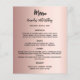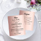 Rose Goldgradientenhintergrund. Schwarzer Text. Front: Personalisieren Sie Ihren Namen, das Datum und das Menü. Zurück: Programm. Wenn Sie ein großes Programm haben, können Sie den Zeilenabstand verringern. 1 Blatt = 1 Menü, mit dem die Kante an Kante aufgedruckt ist.