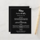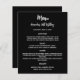 Ein klassischer schwarzer Hintergrund. Weißer Text. Personalisieren Sie Ihren Namen, das Datum und das Menü und fügen Sie es hinzu. Sie können mehr Text hinzufügen, Fotos auf der Rückseite. 1 Blatt = 1 Menü, mit dem die Kante an Kante aufgedruckt ist.