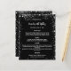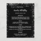 Ein elegantes, glamouröses Menü. Ein schwarzer Hintergrund, mit Imitaten verziert silbernen Glitzer, Glitzern. Weißer Text. Personalisieren Sie Ihren Namen, Daten und das Menü und fügen Sie ihn hinzu. Sie können mehr Text hinzufügen, Fotos auf der Rückseite. 1 Blatt = 1 Menü, mit dem die Kante an Kante aufgedruckt ist.